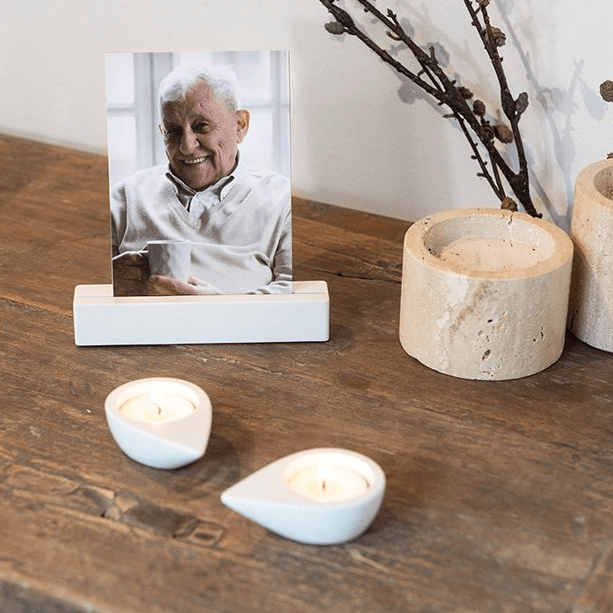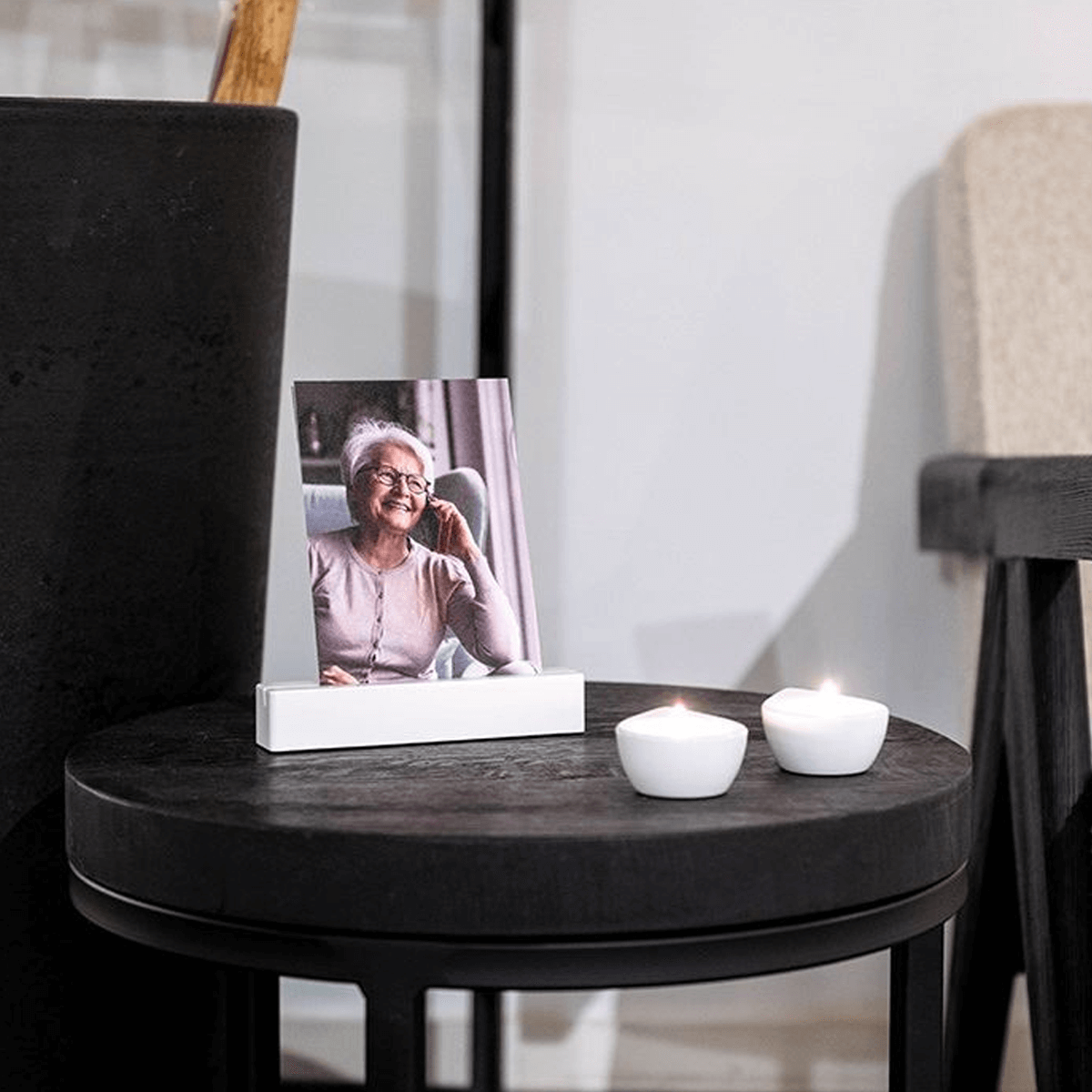 De matte afwerking vangt het warme licht van de kaarsjes op een ingetogen manier. Het schijnsel dat hieruit ontstaat, maakt van elk moment van gedenken iets intiems en persoonlijks. In het midden biedt de fotohouder ruimte aan een dierbare afbeelding: een blik, een herinnering, een stukje van het leven dat voortleeft in gedachten.